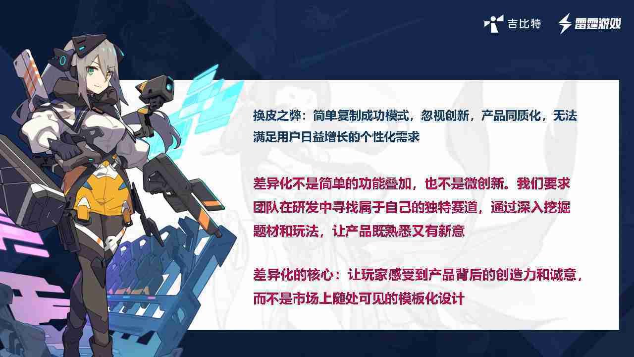 在我们内部是这么定义差异化的。。。首先,,,差异化不是简单的功能叠加,,,,更不是换皮。。。只是换皮,,产品无法提供有效的市场价值。。内部经常说差异化的产品不是为了迎合市场,,,而是找到一个自己独特的表达方式,,,在研发中找到属于自己的细分赛道和独特赛道,,,前提是需要对这个题材有足够的深入、、、、挖掘,,对玩法有足够深入的理解,,,让产品看起来既熟悉又有新意。。
